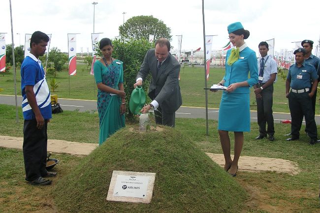 Итак, после 2-х часового отдыха, мы проследовали из гостиницы по терминалу прямо к гейту посадки и вошли в самолет. Через час мы приземлились в аэропорту Маттала и, как говорят, «с корабля на бал». Перед началом торжества состоялась очень красивая церемония – представители авиакомпаний альянса сажали маленькие деревца в парке перед терминалом аэропорта. От российской делегации в церемонии приняли участие директор по стратегическому развитию S7 Airlines Вадим Бесперстов и бортпроводница Алина Лукьянчикова.