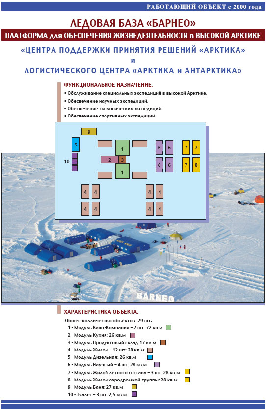 Барнео - ледовый лагерь, ежегодно дрейфующий в районе Северного Полюса. Лагерь Барнео открывается в начале апреля и на целый месяц становится главным научным и туристическим центром России в Арктике. Лагерь организует и поддерживает Экспедиционный центр "Полюс", который является отделом Ассоциации Полярников России руководит которым Герой России, Герой Советского Союза, доктор географических наук, член-корреспондент РАН А.Н. Чилингаров.