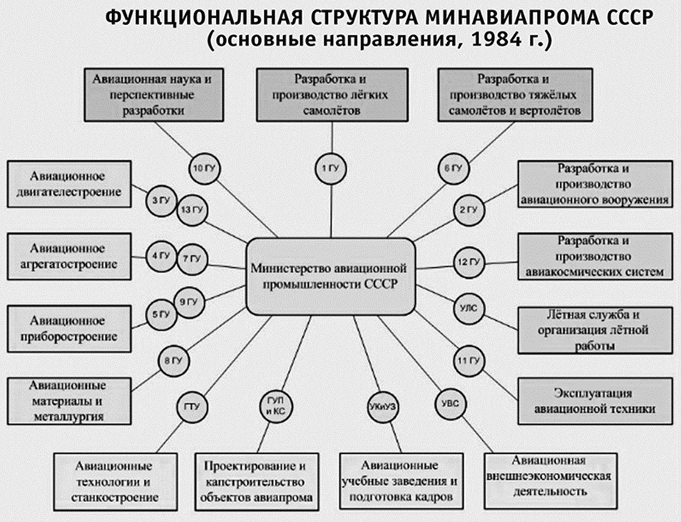 Структура Министерства авиационной промышленности СССР отличалась предельной простотой, ясностью и нацеленностью на решение главной стоящей перед ним задачи – создание в срок качественной и конкурентоспособной авиационной техники в необходимых стране количествах. Руководил всем министр авиационной промышленности, обладавший большими правами, но и несший персональную ответственность за деятельность отрасли. Именно он был главным финансовым распорядителем средств, которые выделялись бюджетом на авиационную промышленность. Эти средства на основании решений коллегии Министерства, в которую входили профильные заместители министра, отвечавшие за конкретную подотрасль, и начальники Главных управлений, отвечавших за определенные направления внутри подотрасли, распределялись между подотраслями. В состав научно-производственных Главных управлений входили подведомственные предприятия, и уже внутри Главных управлений, под ответственность их начальников и профильных заместителей министра, отвечающих за выполнение заданий по соответствующему направлению работ, распределялось финансирование между предприятиями.