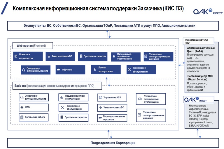Создаваемая «Иркутом» система будет включать несколько взаимосвязанных систем, предназначенных для автоматизации бизнес-процессов послепродажного обслуживания воздушных судов (ППО ВС). Она будет интегрирована как с внутренними информационными ресурсами Корпорации, так и с внешними информационными системами технических поставщиков услуг ППО. Иными словами, создается «единое окно» для решения любых эксплуатационных вопросов, возникающих у авиакомпании в течение всего жизненного цикла самолета.
