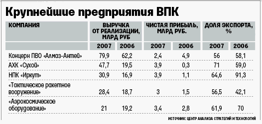 В экспорте в прошлом году доминировала авиация, в основном самолеты Су-30. 42 машины были поставлены в Индию, Малайзию, Венесуэлу и Алжир, что обеспечило рост выручки 'Сухого' с 19,5 млрд до 47,6 млрд руб., а 'Иркута' - с 17 млрд до 31 млрд руб.