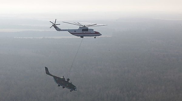 Ми-26 - тяжелый многоцелевой транспортный вертолет, являющийся самым грузоподъемным в мире. Предназначен для перевозки техники и крупногабаритных грузов внутри кабины и на внешней подвеске общей массой до 20 т. Для тушения пожаров применяется транспортируемое на внешней подвеске водосливное устройство, вмещающее до 15 т воды.